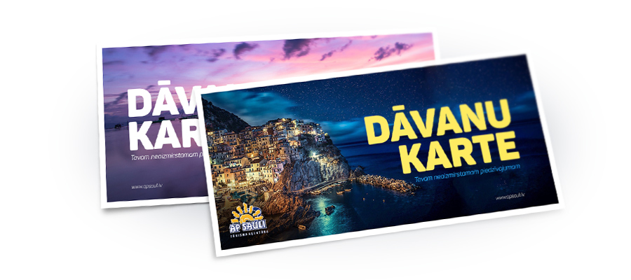 Mūsu Dāvanu Karte dod iespēju katram klientam izvēlēties savu ceļojumu. Kartes vērtību AP SAULI ceļojumu konsultants norāda uz Dāvanu Kartes. Kartē minētā neiztērētā summa netiek atmaksāta un to nedrīkst sadalīt daļās. Ja pirkuma kopējā summa ir augstāka par Kartes vērtību, starpību var nomaksāt skaidrā naudā, ar bankas pārskaitījumu vai ar līdzīgu Dāvanu Karti. Ja pirkuma kopējā summa ir zemāka par kartes vērtību, starpība netiek atmaksāta, bet to var izmantot kā daļu maksājuma jaunas Dāvanu Kartes iegādei. Dāvanu Karte ir derīga 1 (vienu) gadu kopš Kartes pirkšanas brīža.